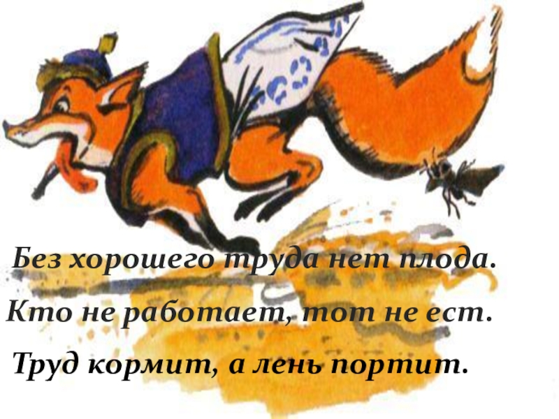Без хорошего труда нет плода.Кто не работает, тот не ест.Труд кормит, а лень портит.