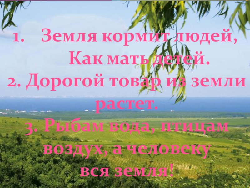 Земля кормит людей, Как мать детей.2. Дорогой товар из земли растет.3. Рыбам вода, птицам воздух, а человеку