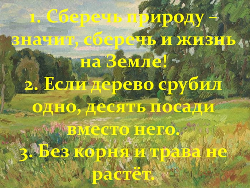 1. Сберечь природу – значит, сберечь и жизнь на Земле!2. Если дерево срубил одно, десять посади вместо