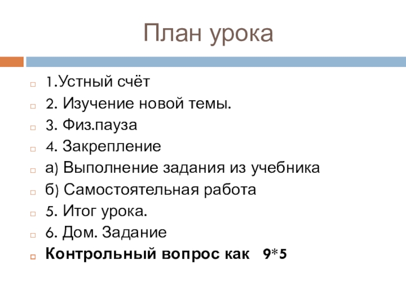 План урока1.Устный счёт2. Изучение новой темы.3. Физ.пауза4. Закреплениеа) Выполнение задания из учебникаб) Самостоятельная работа5. Итог урока.6. Дом. ЗаданиеКонтрольный вопрос как 9*5