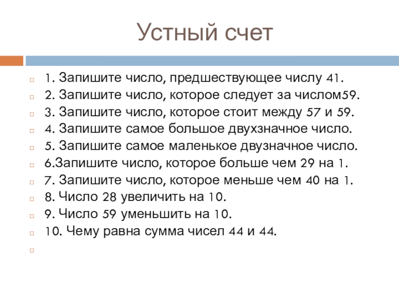Устный счет1. Запишите число, предшествующее числу 41.2. Запишите число, которое следует за числом59.3. Запишите число, которое стоит