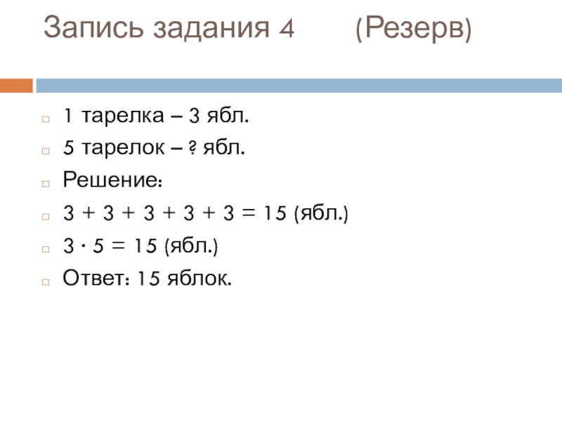 Запись задания 4    (Резерв) 1 тарелка – 3 ябл.5 тарелок – ? ябл.Решение:3 +
