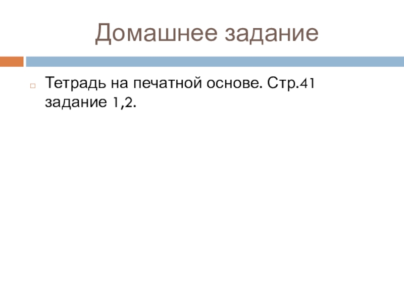 Домашнее заданиеТетрадь на печатной основе. Стр.41 задание 1,2.