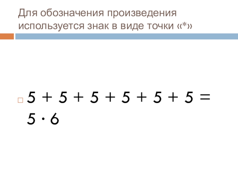 Для обозначения произведения используется знак в виде точки «*»5 + 5 + 5 + 5 + 5