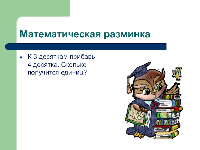 Математическая разминкаК 3 десяткам прибавь 4 десятка. Сколько получится единиц?