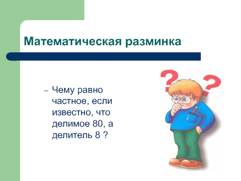 Математическая разминкаЧему равно частное, если известно, что делимое 80, а делитель 8 ?