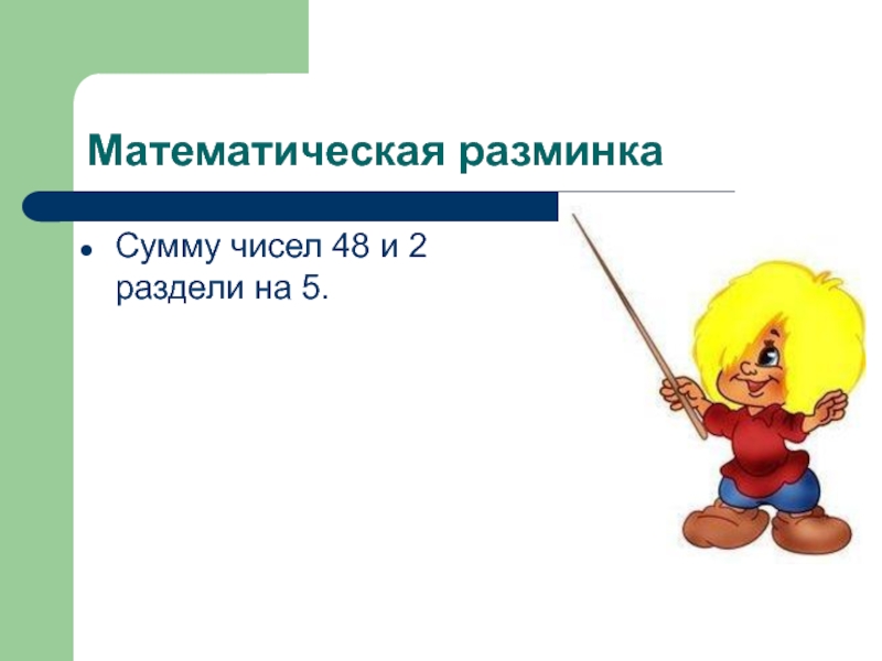 Математическая разминкаСумму чисел 48 и 2 раздели на 5.
