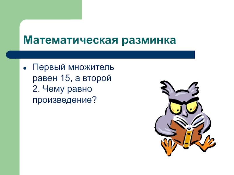 Математическая разминкаПервый множитель равен 15, а второй 2. Чему равно произведение?