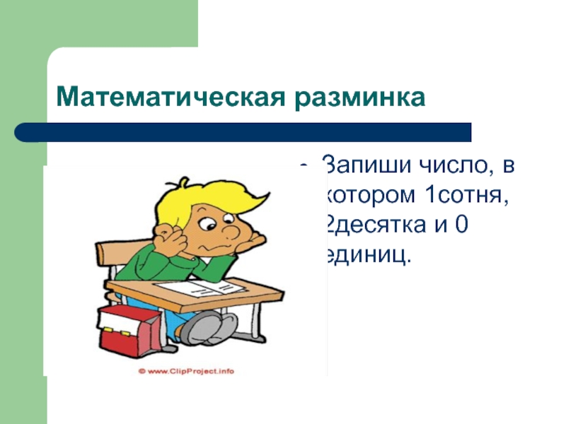 Математическая разминкаЗапиши число, в котором 1сотня, 2десятка и 0 единиц.