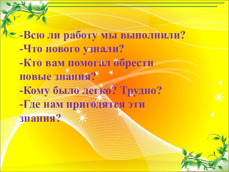 -Всю ли работу мы выполнили?  -Что нового узнали? -Кто вам помогал обрести новые знания? -Кому было