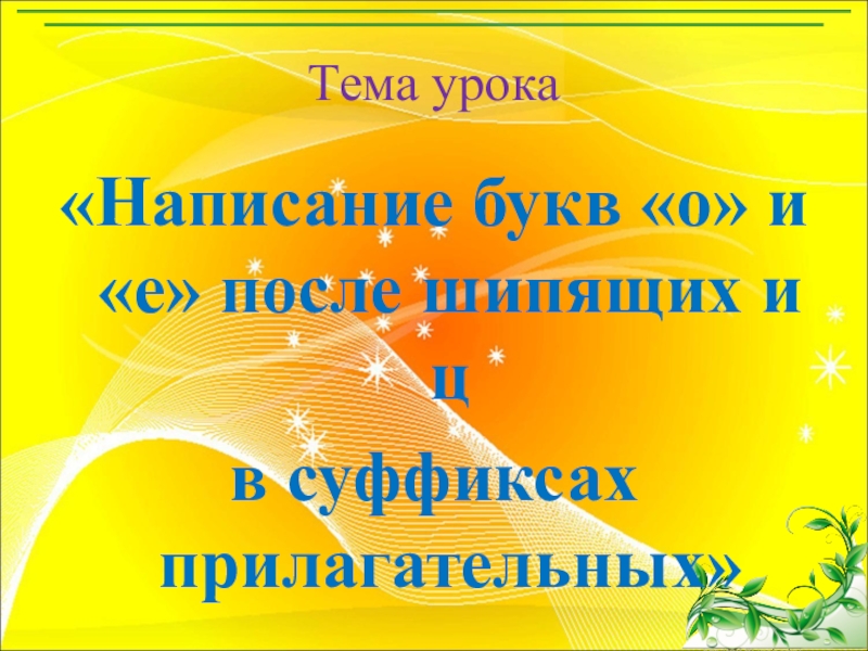 Тема урока«Написание букв «о» и «е» после шипящих и ц в суффиксах прилагательных»