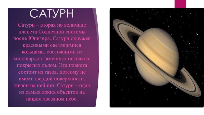 окружен красивыми светящимися кольцами, состоящими из миллиардов каменных осколков, покрытых льдом. Эта планета состоит из газов, поэтому не имеет твердой поверхности, жизни на ней нет. Сатурн – одна из самых ярких объектов на нашем звездном небе.