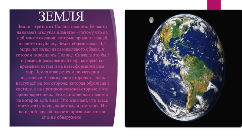 - потому что на ней много океанов, которые придают нашей планете голубизну. Земля образовалась 4,5 млрд лет назад из газопылевого облака, в котором зародилось Солнце. Сначала это был огромный раскаленный шар, который со временем остыл и на нем сформировался мир. Земля вращается и поочередно подставляет Солнцу свои сторонки – день наступает на той стороне, которая обращена к светилу, а на противоположной стороне в это время царит ночь. Это единственная планета на которой есть вода. Это означает, что здесь могут жить люди, животные и растения. Ни на одной другой планете признаков жизни еще не обнаружено.