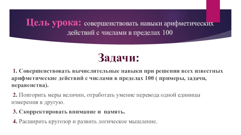 Слайд 2Цель урока: совершенствовать навыки арифметических действий с числами в пределах 100