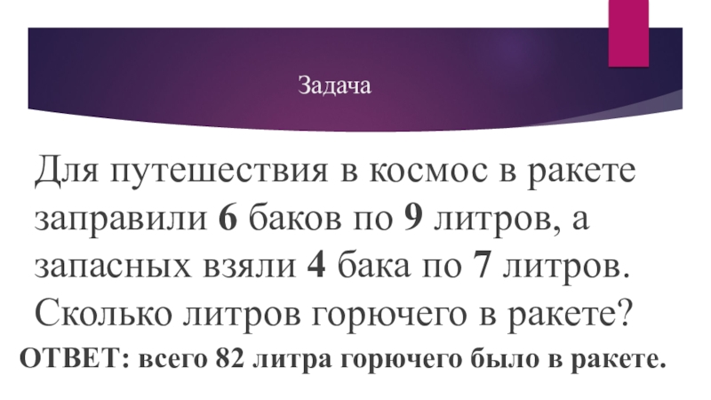 литров, а запасных взяли 4 бака по 7 литров. Сколько литров горючего в ракете?