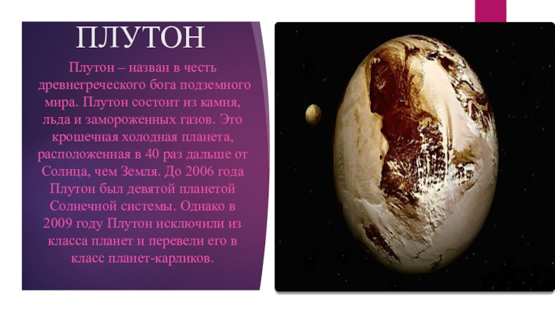 Плутон – назван в честь древнегреческого бога подземного мира. Плутон состоит