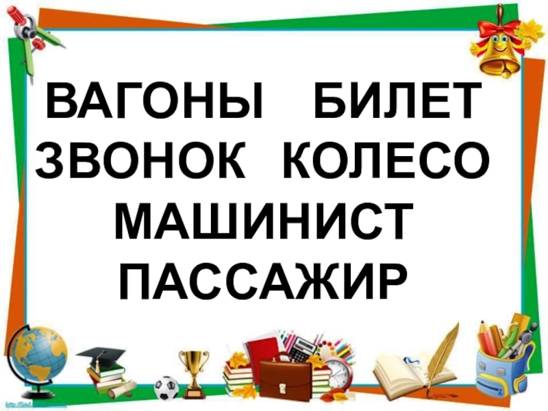 Слайд 8ВАГОНЫ БИЛЕТ ЗВОНОК КОЛЕСО МАШИНИСТ ПАССАЖИР