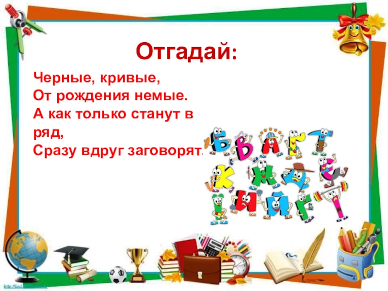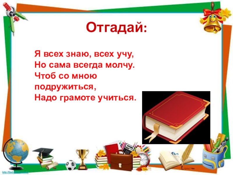 Отгадай:Я всех знаю, всех учу,Но сама всегда молчу.Чтоб со мною подружиться,Надо грамоте учиться.