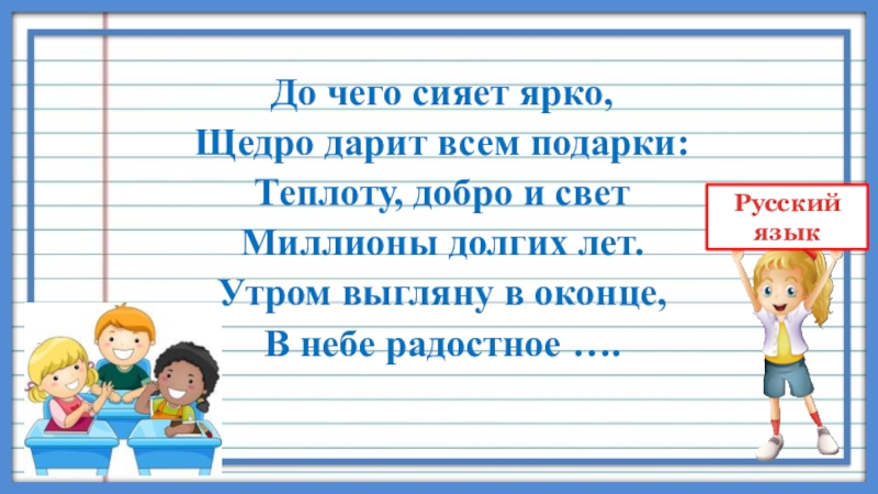 До чего сияет ярко,Щедро дарит всем подарки:Теплоту, добро и светМиллионы долгих лет.Утром выгляну в оконце,В небе радостное ….