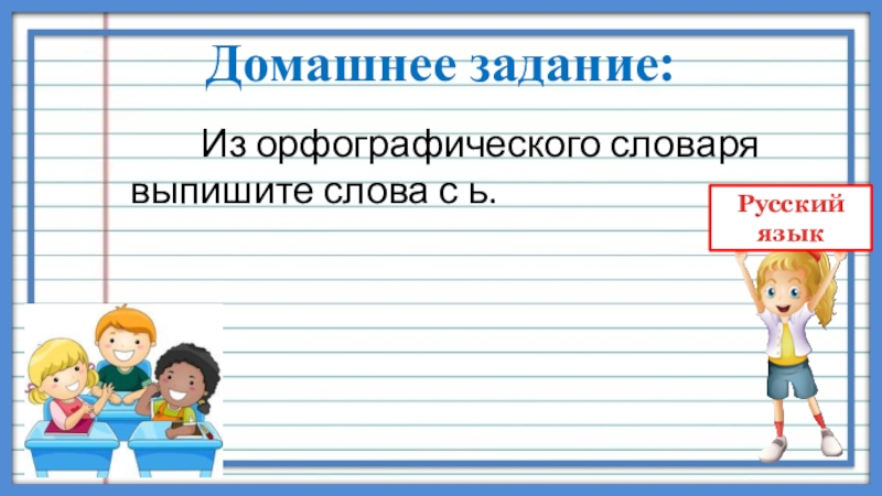 Домашнее задание:    Из орфографического словаря выпишите слова с ь.