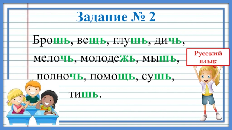 Задание № 2    Брошь, вещь, глушь, дичь,      мелочь, молодежь,