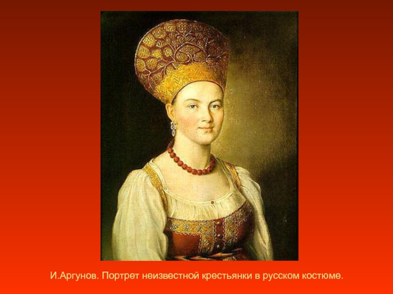 Слайд 3 И.Аргунов. Портрет неизвестной крестьянки в русском костюме.
