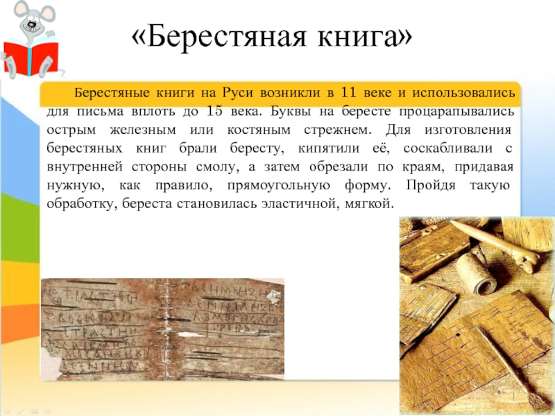 использовались для письма вплоть до 15 века. Буквы на бересте процарапывались острым железным или костяным стрежнем. Для изготовления берестяных книг брали бересту, кипятили её, соскабливали с внутренней стороны смолу, а затем обрезали по краям, придавая нужную, как правило, прямоугольную форму. Пройдя такую обработку, береста становилась эластичной, мягкой.
