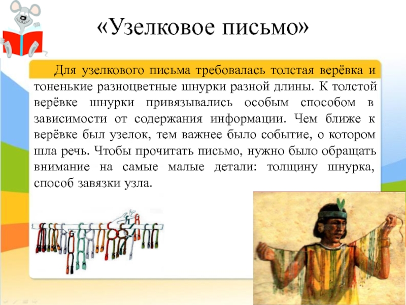 разной длины. К толстой верёвке шнурки привязывались особым способом в зависимости от содержания информации. Чем ближе к верёвке был узелок, тем важнее было событие, о котором шла речь. Чтобы прочитать письмо, нужно было обращать внимание на самые малые детали: толщину шнурка, способ завязки узла.