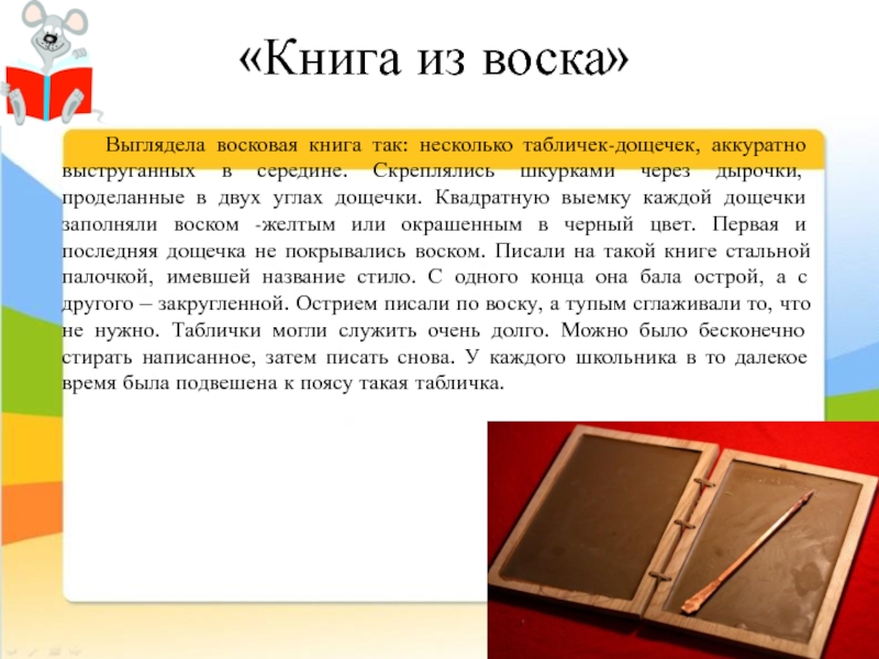 середине. Скреплялись шкурками через дырочки, проделанные в двух углах дощечки. Квадратную выемку каждой дощечки заполняли воском -желтым или окрашенным в черный цвет. Первая и последняя дощечка не покрывались воском. Писали на такой книге стальной палочкой, имевшей название стило. С одного конца она бала острой, а с другого – закругленной. Острием писали по воску, а тупым сглаживали то, что не нужно. Таблички могли служить очень долго. Можно было бесконечно стирать написанное, затем писать снова. У каждого школьника в то далекое время была подвешена к поясу такая табличка.