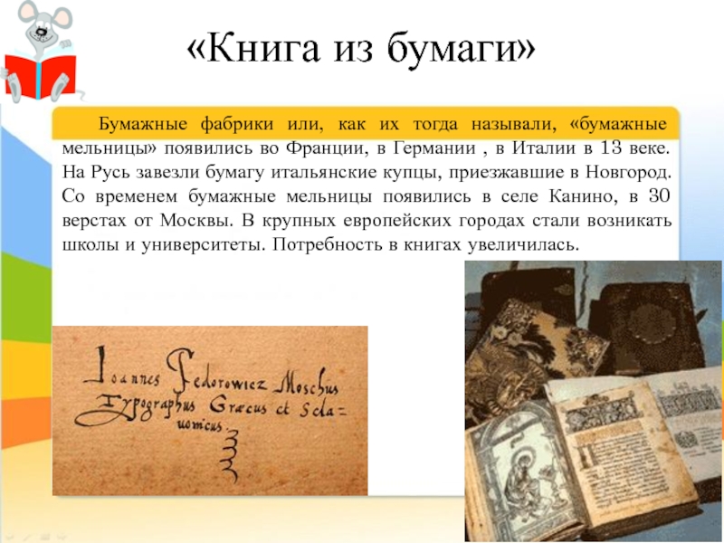 появились во Франции, в Германии , в Италии в 13 веке. На Русь завезли бумагу итальянские купцы, приезжавшие в Новгород. Со временем бумажные мельницы появились в селе Канино, в 30 верстах от Москвы. В крупных европейских городах стали возникать школы и университеты. Потребность в книгах увеличилась.
