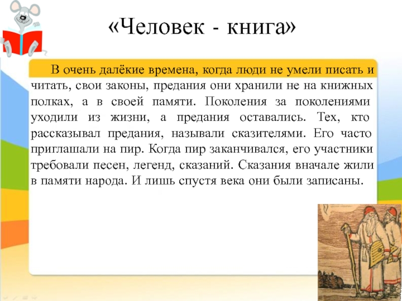 и читать, свои законы, предания они хранили не на книжных полках, а в своей памяти. Поколения за поколениями уходили из жизни, а предания оставались. Тех, кто рассказывал предания, называли сказителями. Его часто приглашали на пир. Когда пир заканчивался, его участники требовали песен, легенд, сказаний. Сказания вначале жили в памяти народа. И лишь спустя века они были записаны.