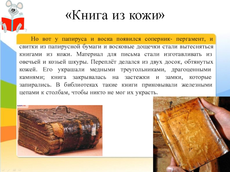 и свитки из папирусной бумаги и восковые дощечки стали вытесняться книгами из кожи. Материал для письма стали изготавливать из овечьей и козьей шкуры. Переплёт делался из двух досок, обтянутых кожей. Его украшали медными треугольниками, драгоценными камнями; книга закрывалась на застежки и замки, которые запирались. В библиотеках такие книги приковывали железными цепами к столбам, чтобы никто не мог их украсть.