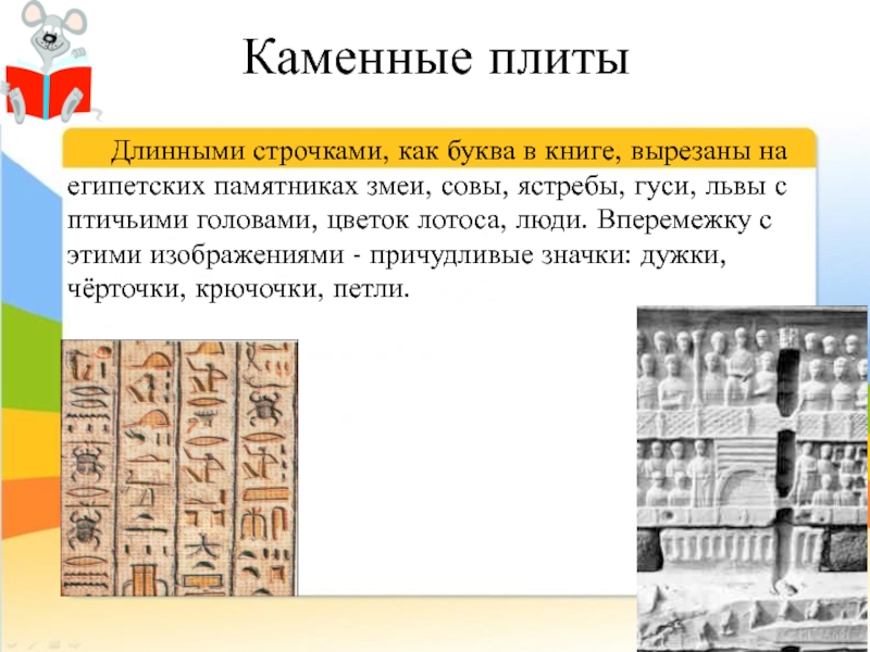 памятниках змеи, совы, ястребы, гуси, львы с птичьими головами, цветок лотоса, люди. Вперемежку с этими изображениями - причудливые значки: дужки, чёрточки, крючочки, петли.