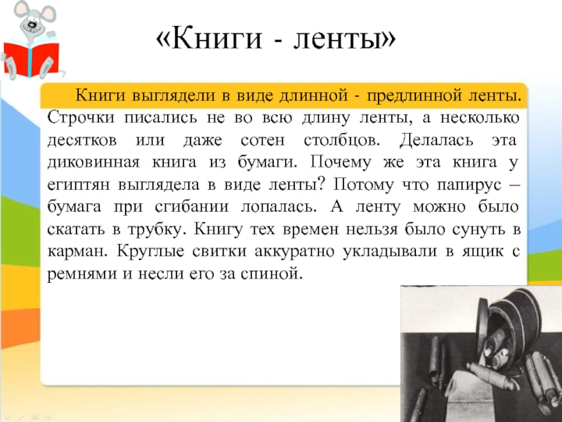 писались не во всю длину ленты, а несколько десятков или даже сотен столбцов. Делалась эта диковинная книга из бумаги. Почему же эта книга у египтян выглядела в виде ленты? Потому что папирус – бумага при сгибании лопалась. А ленту можно было скатать в трубку. Книгу тех времен нельзя было сунуть в карман. Круглые свитки аккуратно укладывали в ящик с ремнями и несли его за спиной.