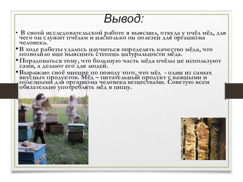 Пчела – единственное насекомое, дающее человеку полезную и вкусную пищу – мед. Пчелы – насекомые величиной 1,5-2см. Пчелы живут семьями. Возглавляет пчелиную семью матка, она почти в два раза длиннее других пчел. Без матки нет семьи.
