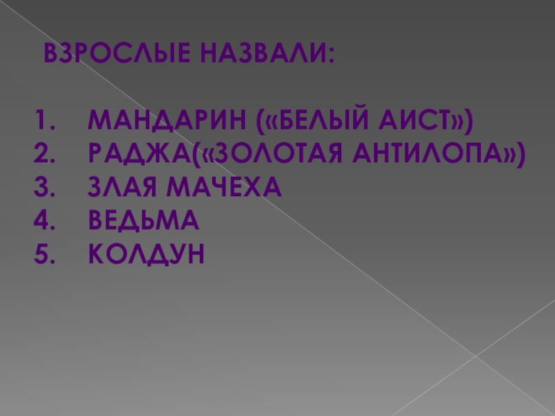 Взрослые назвали:Мандарин («белый аист»)Раджа(«золотая антилопа»)Злая мачехаВедьмаКолдун