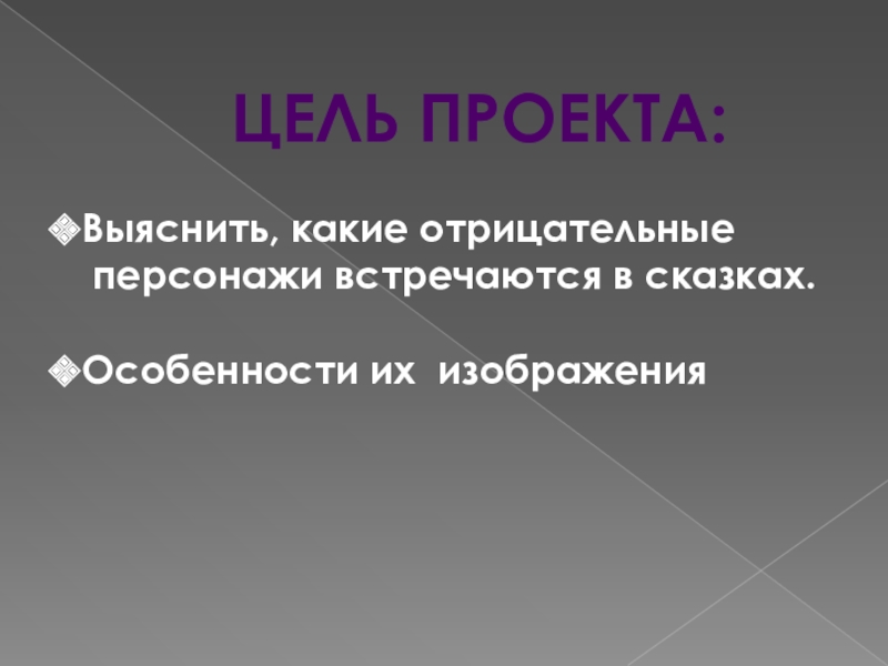 Цель проекта:Выяснить, какие отрицательные персонажи встречаются в сказках.Особенности их изображения
