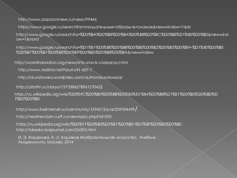 http://www.popcornnews.ru/news/99446https://www.google.ru/search?q=отрицательные+образы+в+сказках&newwindow=1&rlzhttp://www.google.ru/search?q=%D0%BA%D0%B8%D0%BA%D0%B8%D0%BC%D0%BE%D1%80%D0%B0&newwindow=1&nordhttp://www.google.ru/search?q=%D1%81%D0%BE%D0%BB%D0%BE%D0%B2%D0%B5%D0%B9+%D1%80%D0%B0%D0%B7%D0%B1%D0%BE%D0%B9%D0%BD%D0%B8%D0%BA&newwindowhttp://worldtranslation.org/news/416-who-is-vodyanoy.htmlhttp://www.radimir.net/forum/41-607-1http://skuratovska.wordpress.com/author/skuratovska/http://pilotfm.ru/darya7/375386278961270422https://ru.wikipedia.org/wiki/%D0%9C%D0%B0%D0%BB%D0%B5%D1%84%D0%B8%D1%81%D0%B5%D0%BD%D1%82%D0%B0http://www.liveinternet.ru/community/1594513/post259394499/http://heathendom.rusff.ru/viewtopic.php?id=392https://ru.wikipedia.org/wiki/%D0%91%D0%B0%D0%B1%D0%B0-%D1%8F%D0%B3%D0%B0http://taberko.livejournal.com/26559.htmlИ. Э. Кашекова, А. Л. Кашеков Изобразительное искусство. УчебникАкадемкнига, Москва, 2014