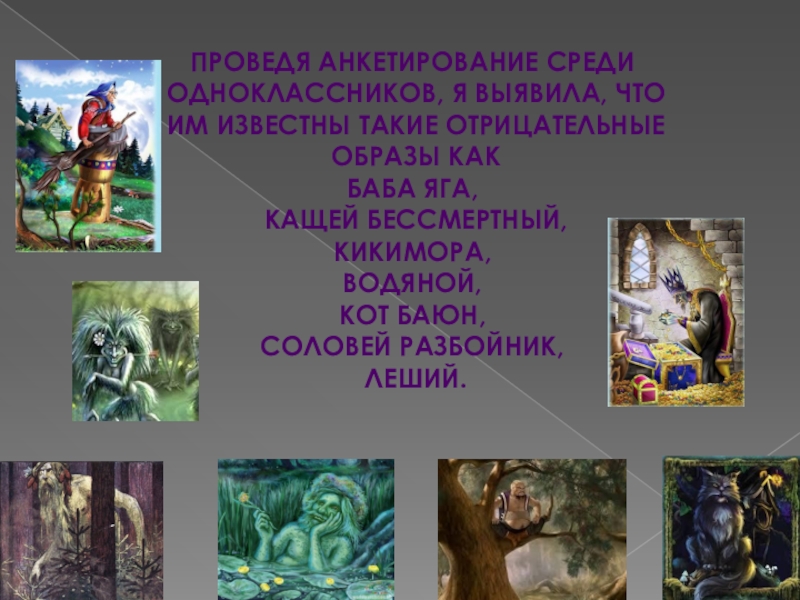 проведя анкетирование среди одноклассников, я выявила, что им известны такие отрицательные образы как баба яга, кащей бессмертНый,