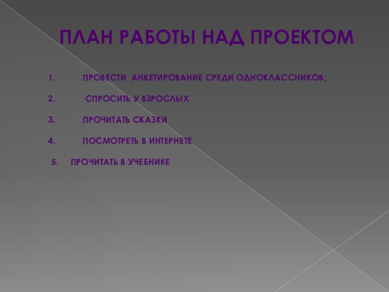 План работы над проектомПровести анкетирование среди одноклассников; Спросить у взрослыхПрочитать сказкиПосмотреть в интернете5. 	Прочитать в учебнике