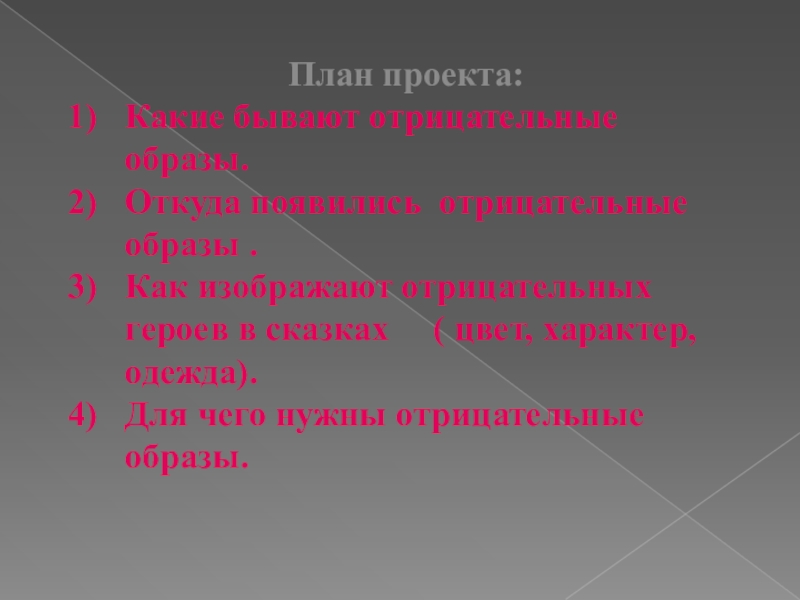 План проекта:Какие бывают отрицательные образы.Откуда появились отрицательные образы .Как изображают отрицательных героев в сказках   (
