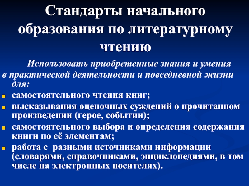 Стандарты начального образования по литературному чтению		Использовать приобретенные знания и умения в практической деятельности и повседневной жизни для:самостоятельного