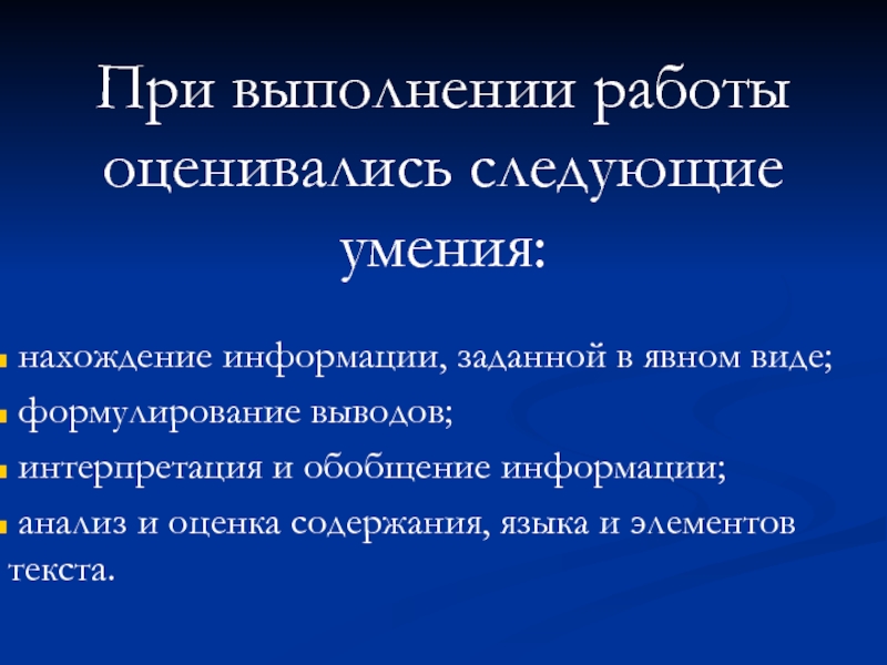 При выполнении работы оценивались следующие умения:  нахождение информации, заданной в явном виде; формулирование выводов; интерпретация