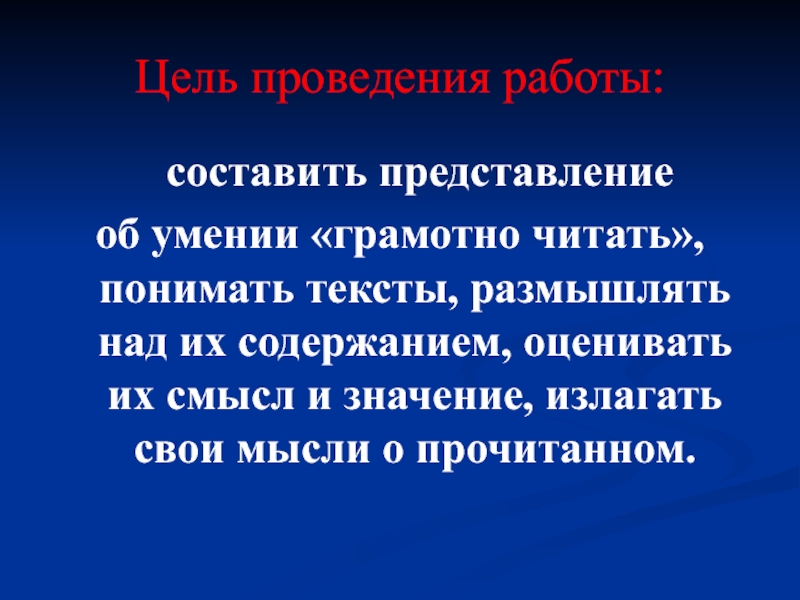 Цель проведения работы:	составить представление об умении «грамотно читать», понимать тексты, размышлять над их содержанием, оценивать их смысл