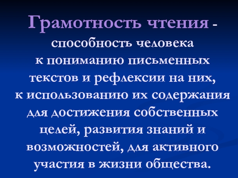 Грамотность чтения - способность человека к пониманию письменных текстов и рефлексии на них, к использованию их содержания для достижения собственных целей, развития знаний и возможностей, для активного участия в жизни общества.