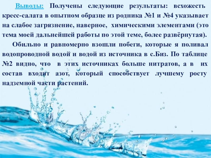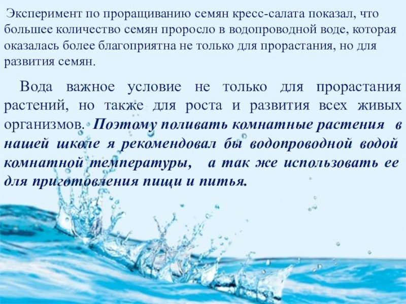 Вода важное условие не только для прорастания растений, но также для роста и развития всех живых организмов. Поэтому поливать комнатные растения в нашей школе я рекомендовал бы водопроводной водой комнатной температуры, а так же использовать ее для приготовления пищи и питья.