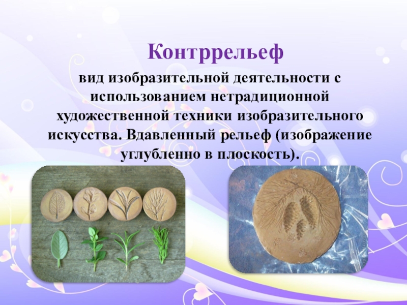 «Контррельеф» - вдавленный рельеф (изображение углублено в плоскость).