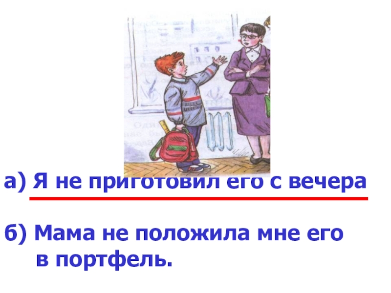 а) Я не приготовил его с вечераб) Мама не положила мне его   в портфель.