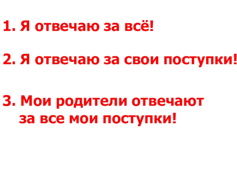 1. Я отвечаю за всё!2. Я отвечаю за свои поступки!3. Мои родители отвечают  за все мои