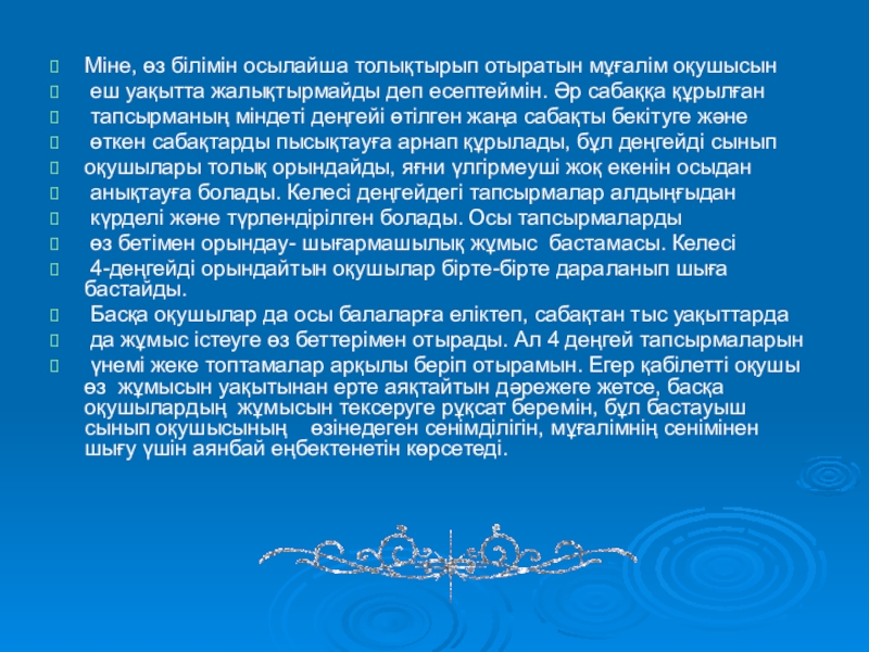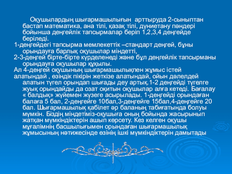 алатындай , өзіндік пікірін жеткізе алатындай, ойын дәлелдей алатын түгел орындап шығады деу артық.1-2 деңгейді түгелге жуық орындайды да озат оқитын оқушылар алға кетеді. Бағалау « балдық» жүйемен жүзеге асырылады. 1-деңгейді орындаған балаға 5 бал, 2-деңгейге 10бал,3-деңгейге 15бал,4-деңгейге 20 бал. Шығармашылық қабілет әр баланың табиғатында болуы мүмкін. Біздің міндетіміз-оқушыға оның бойында жасырынып жатқан мүмкіндіктерін ашып көрсету. Кез келген оқушы мұғалімнің басшылығымен орындаған шығармашылық жұмысының нәтижесінде өзінің ішкі мүмкіндіктерін дамытады
